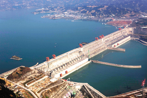 1994年12月14日,當(dāng)今世界第一大的水電工程--三峽大壩工程正式動(dòng)工,它位于西陵峽中段的湖北省宜昌市境內(nèi)的三斗坪,距下游葛洲壩水利樞紐工程38公里。三峽大壩工程包括主體建筑物工程及導(dǎo)流工程兩部分,工程總投資為954.6億元人民幣(按1993年5月末價(jià)格計(jì)算),其中樞紐工程500.9億元;113萬移民的安置費(fèi)300.7億元;輸變電工程153億元。工程施工總工期自1993年到2009年共17年,分三期進(jìn)行,到2009年工程全部完工。大壩為混凝土重力壩,壩頂總長(zhǎng)3035米,壩頂高程185米,正常蓄水位175米,總庫容393億立方米,其中防洪庫容221.5億立方米,能夠抵御百年一遇的特大洪水。配有26臺(tái)發(fā)電機(jī)的兩個(gè)電站年均發(fā)電量849億度。航運(yùn)能力將從現(xiàn)有的1000萬噸提高到5000萬噸,萬噸級(jí)船隊(duì)可直達(dá)重慶,同時(shí)運(yùn)輸成本也將降低35%。